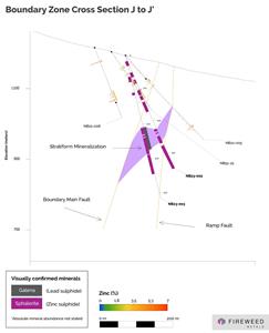 The 2023 step-outs completed so far have successfully intersected sphalerite and galena mineralization as stratiform massive sulphides, replacement mineralization, veins, and breccias. Hole NB23-003 intersected 73 m of massive sulphide that is interpreted to be the first intersection of the conceptual feeder zone target. The remaining holes of the Phase 1 program will continue drill testing of the mineralized layers as well as the potential feeder area that may link Boundary Main and Boundary West (Long Section I–I’, Cross Section H–H’, Cross Section J–J’ and Map 2).