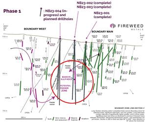 The initial phase of the 2023 drilling program targets a gap in the drilling between two of Fireweed’s best-ever drillholes at Boundary Zone, NB22-002 and NB22-023, where Fireweed sees the potential for a high-grade feeder zone target that could link Boundary West and Boundary Main. These 2022 holes intersected very wide, high-grade zones and flank either side of the target being tested in Phase 1: NB22-023 intersected 298 m of 4.5% zinc, 1.4% lead, and 30.9 g/t silver including a new stratiform zone of 9.6 m grading 24.5% zinc, 15.1% lead, and 323.2 g/t silver; and hole NB22-002 intersected 124 m at 12.3% zinc, 1.3% lead, 45.9 g/t silver (see Fireweed news releases dated November 22, 2022, and March 2, 2023).