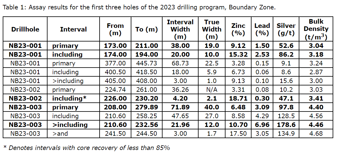 - NB23-001 intersected 38.00 m of 9.12 per cent zinc, 1.50 per cent lead, 52.6 g/t silver, including 20.00 m of 15.32 per cent zinc, 2.53 per cent lead, 86.2 g/t silver.