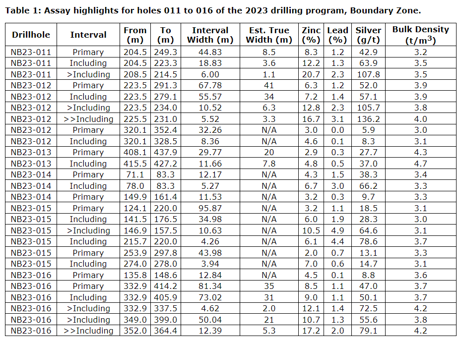 Hole NB23-011 intersected 44.83 m of stratiform massive sulphide (8.5 m estimated true width) grading 8.30 per cent zinc, 1.16 per cent lead and 42.9 g/t silver, and two other intercepts of vein-style mineralization: 7.99 m grading 4.47 per cent zinc and 8.9 g/t silver, and 9.03 m grading 3.69 per cent zinc, 0.31 per cent lead and 26.4 g/t silver.