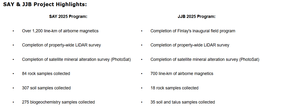 FINLAY MINERALS COMPLETES FIELD WORK ON NEWLY IDENTIFIED GEOPHYSICAL TARGETS ON THE SAY AND JJB PROPERTIES