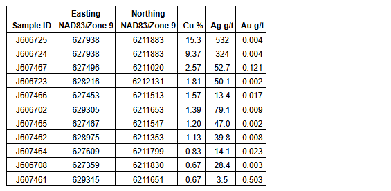 - Identifying a 1,700 m by 1,000 m high-grade copper (Cu) and silver (Ag) mineralized footprint at the IFT target, including a rock sample with 15.3 per cent Cu and 532 g/t Ag;