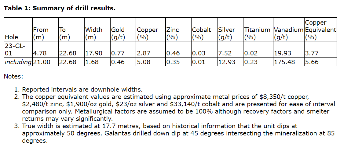 Hole 23-GL-01 intersected 2.87 per cent copper, 0.77 gram per tonne gold, 0.46 per cent zinc, 0.03 per cent cobalt and 7.52 g/t silver over 17.9 metres, including 5.08 per cent Cu, 0.46 g/t Au, 0.35 per cent Zn, 12.93 g/t Ag, 0.01 per cent Co, 0.23 per cent titanium and 176 g/t vanadium over 1.68 metres.