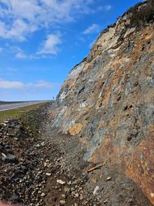 Figure 2: Road cutting where new massive sulphide has been observed in bedrock.