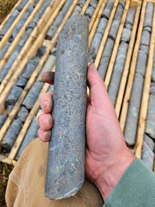 Figure 1: Part of a split section of drill core from hole 23-GL-01 showing massive sulphide.