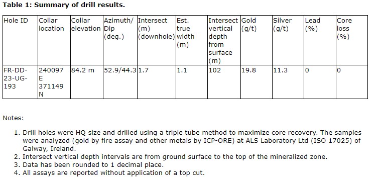 Hole FR-DD-23-UG-193 intersected 19.8 grams per tonne (g/t) gold (Au) and 11.3 g/t silver (Ag) over 1.7 metres targeting the Kearney B-lens (see attached table). This is the most northerly intersection in the latest underground drill program, and provides important information on the course and continuity of mineralization outside the main Kearney vein.