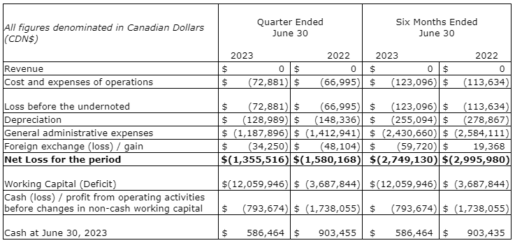 The Net Loss for the quarter ended June 30, 2023 amounted to $ 1,355,516 (2022: $1,580,168) and the cash outflow from operating activities before changes in non-cash working capital for the quarter ended June 30, 2023 amounted to $ 793,674 (2022: $1,738,055). The main difference in the reduction in net loss is due to a reduction in the value attributed to stock based compensation and an increase in financing activities from 2021.