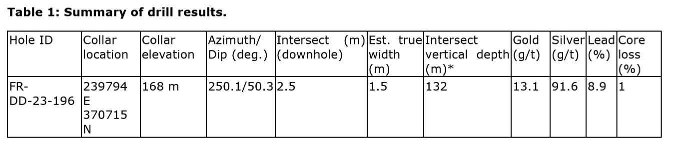 Hole FR-DD-23-196 targeted a gap in the earlier resource model on the main Joshua vein, intersecting 13.1 grams per tonne (g/t) gold (Au) and 91.6 g/t silver (Ag) over 2.5 metres.