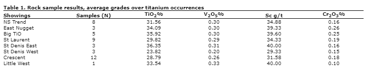 "These titanium occurrences are exceptionally high grade and of remarkable consistency, with an average grade of 28.1 per cent TiO2 over 64 rock samples," stated Dr. Jaap Verbaas, interim CEO of Gama. "Titanium is a critical metal, as are the associated metals scandium and vanadium which are also hosted in these new titanium occurrences. The HSP region boasts the largest ilmenite mine in the world, Lac Tio, 100 km south of the Tyee claims. At Lac Tio, Rio Tinto Fer et Titanium produces titanium and iron, and for the last two years, has been the only North American producer of scandium. Encountering these initial grades of a diverse set of critical metals at Gama's Tyee project, in newly discovered occurrences and under the backdrop of the largest solid ilmenite deposit in the world is very exciting. Our near-term focus will be to evaluate the strike length, width, and depth of these occurrences with a combination of drilling and ground geophysics."