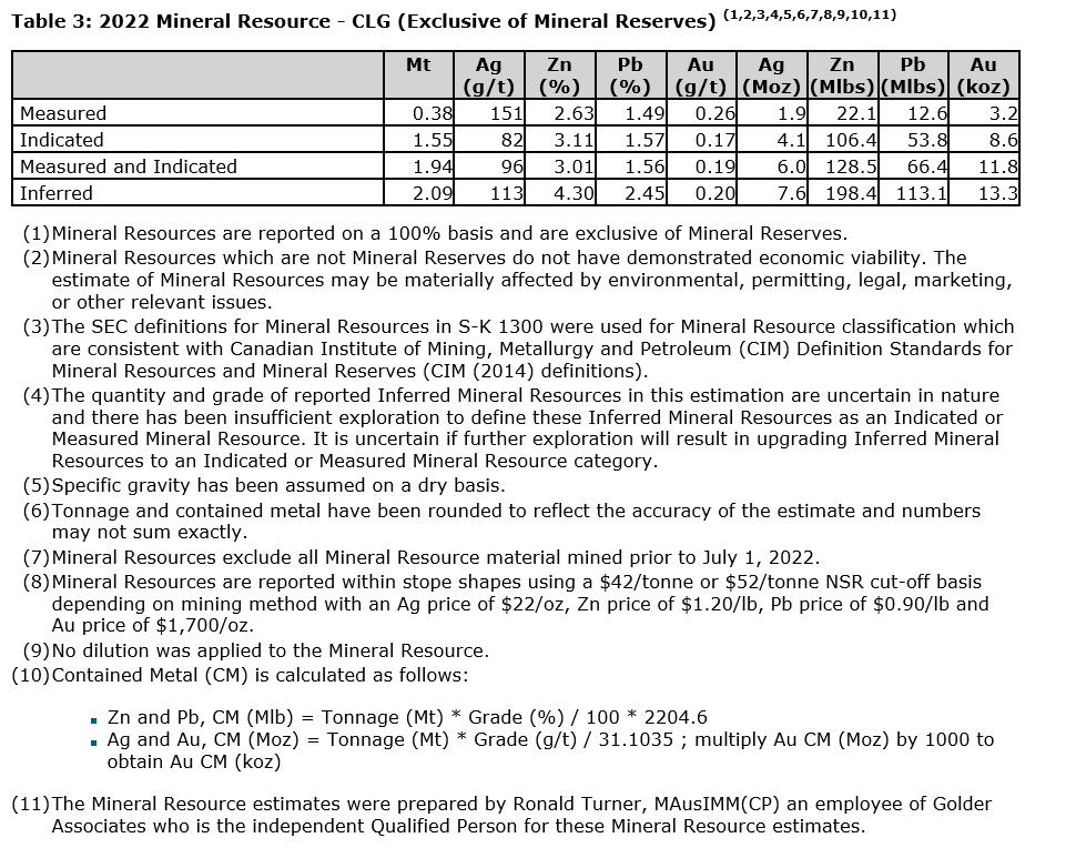 2022 mineral reserve and 2022 mineral resource (CLG -- 100-per-cent basis):