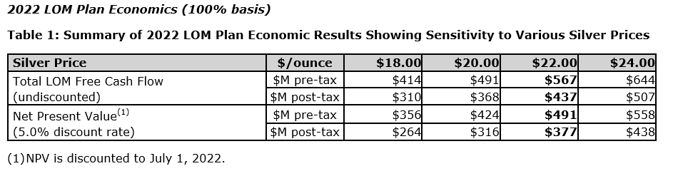 Average annual production of 7.4 million ounces of silver with average annual cash flow of $79-million (after tax) through 2028 at price of $22 per ounce silver;