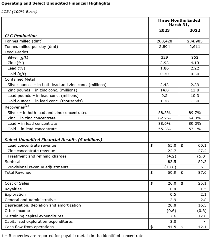 As previously disclosed, CLG mine production in Q1 2023 was slightly higher for silver, zinc and gold, and slightly lower for lead.