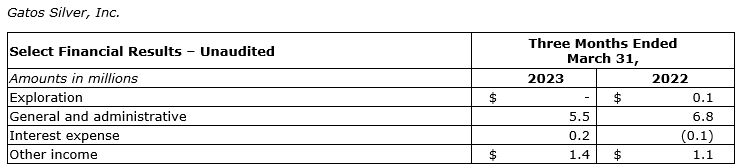 GATOS SILVER REPORTS SELECT UNAUDITED FIRST QUARTER 2023 AND FOURTH QUARTER 2022 RESULTS AND PROVIDES UPDATE ON FINANCIAL RESTATEMENTS