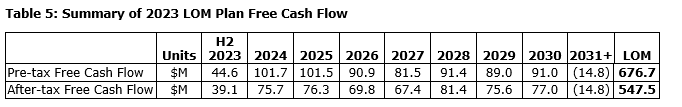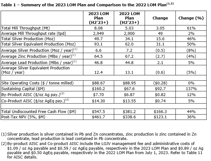 An attached table presents a comparison of key metrics of the 2023 LOM plan with the 2022 LOM plan considering the comparable periods from July 1, 2023, onward (the effective date of the 2023 LOM plan).