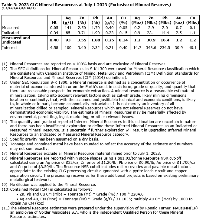 The 2023 mineral reserve for CLG by reserve category is summarized in an attached table and the CLG 2023 mineral resource reported by category is summarized in another table.