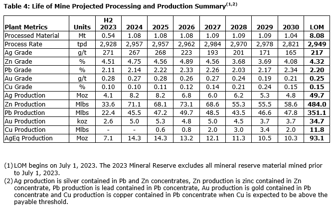 Average annual production over the LOM of 6.6 million ounces of silver, 65 million pounds of zinc and 47 million pounds of lead, or 12.4 million ounces of silver equivalent (4) production;