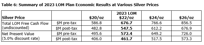 An attached table presents a sensitivity of 2023 LOM plan economic results to silver prices.