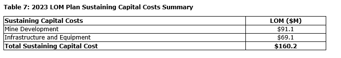 The total sustaining capital cost for the 2023 LOM plan at CLG is estimated at $160.2-million. Sustaining capital costs are summarized in an attached table.