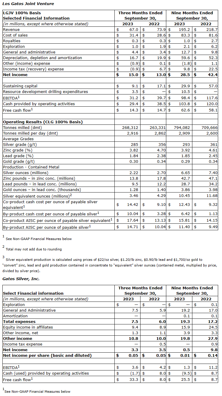 Gatos Silver Q3 2023 results compared to Q3 2022: