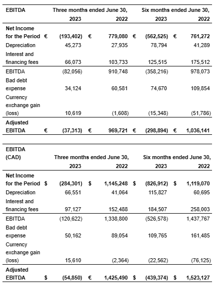 Adjusted EBITDA for the three- and six-month period ended June 30, 2023, was (40,000) euros ($60,000) and (300,000) euros ($440,000) compared with 970,000 euros ($1.43-million) and 1.04 million euros ($1.52-million) for the same period in 2022.
