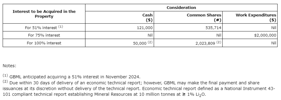 On Nov. 8, 2021, the company entered into a property option agreement with Kevin Keats and Allan Keats (together, the optionors) to acquire up to a 100-per-cent interest in the La Poile lithium project in Newfoundland (see Nov. 16, 2021, press release). Pursuant to the agreement, the company may acquire up to a 100-per-cent interest in the property by meeting certain milestones, and making certain staged cash payments and share issuances to the optionors.
