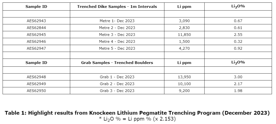 Global Battery Metals Ltd. has released assay results from the initial Knockeen shallow trench sampling program of one-metre-to-two-metre depth completed in December, 2023, at Global Battery's Leinster lithium project in Ireland.