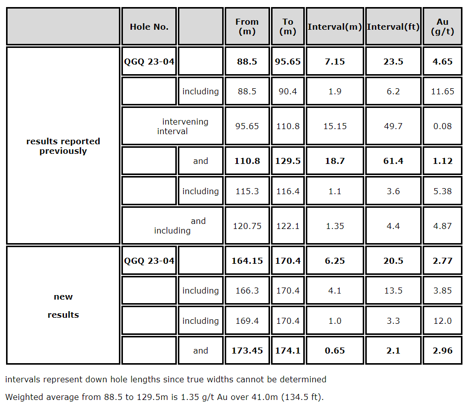 MULTIPLE BROAD INTERCEPTS OF REPLACEMENT GOLD MINERALIZATION INTERSECTED IN DRILL HOLE QGQ23-04