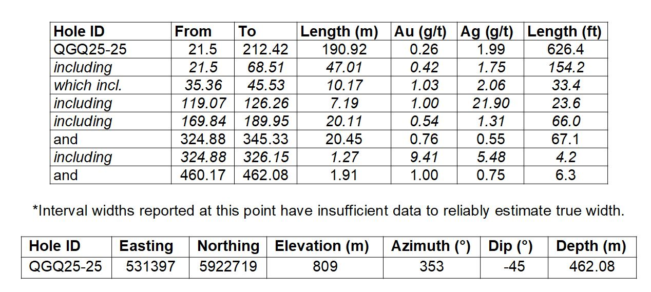 Diamond drill hole QGQ25-25 is a stepout in the Halo zone, with the collar being 96 m to the north-northeast of QGQ24-20, which returned 0.99 g/t Au and 9.77 g/t silver over 236.88 m. QGC25-28, an 80-metre step north of diamond drill hole QGQ25-25, is currently being extended to target depth, intersecting extensive quartz-carbonate veins.