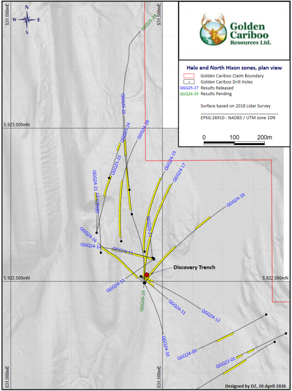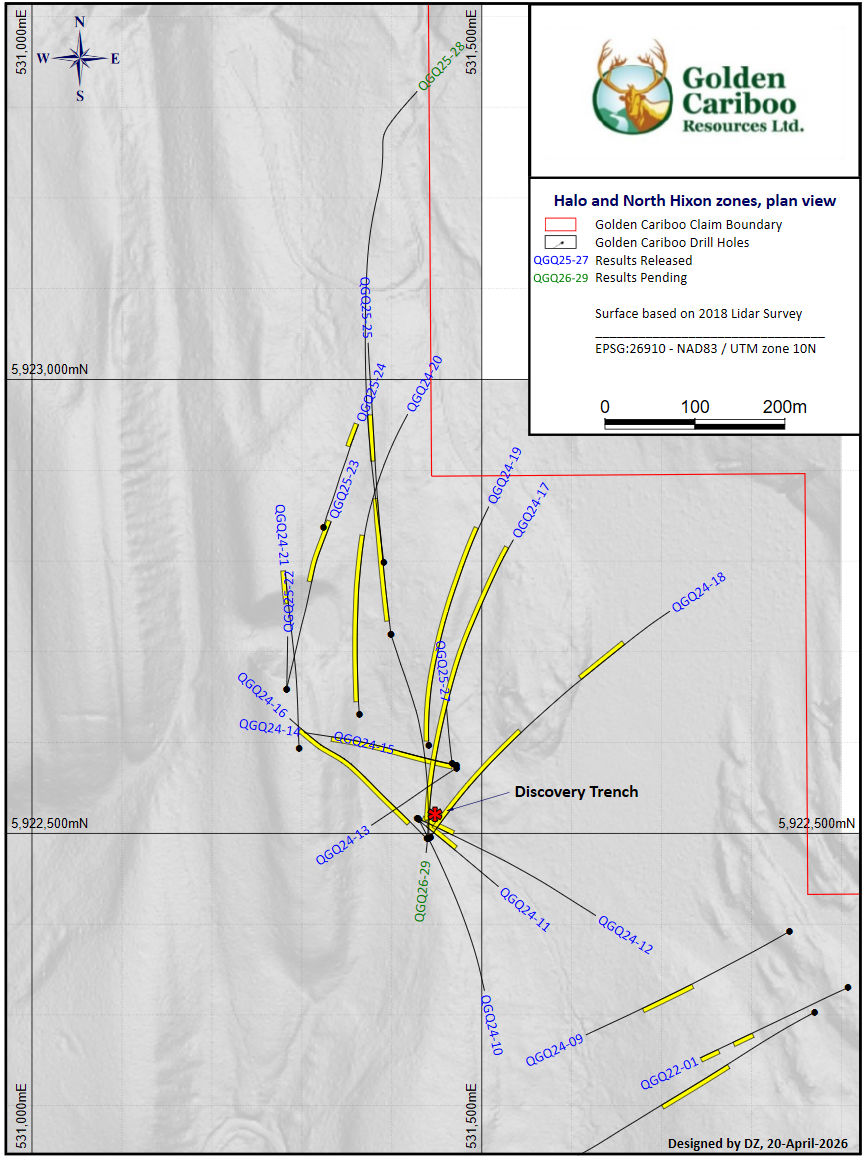 Drill hole QGQ26-29 was collared at the same drill pad as QGQ24-25 and was aligned to 170°/-72° dip to target internally modelled data adjacent the strike of the greenstone contact vertically below the Company’s earlier drilling.  QGQ26-29 was drilled to a depth of about 660m (2,166 ft) and successfully intercepted numerous internally modelled zones and may have identified a new mineralized zone near the end of hole, about 600m (1,969 ft) vertically below the initial Discovery trench and QGQ24-17 collar. The end of QGQ26-29 is described as andesitic tuff with moderate sericite-silica alteration. Quartz-carbonate veinlets comprise approximately 3–5%, locally increasing to 10–12% and overall approximately 2% disseminated and replacement pyrite.   Logging and sampling is in progress with assays from the top of hole currently pending. Maps are available at https://goldencariboo.com/news/