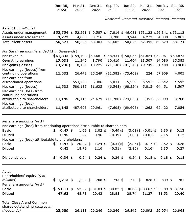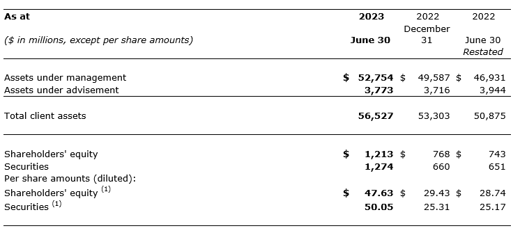 The company's total client assets as at June 30, 2023, were $56.5-billion, which include assets under management and assets under advisement. This is a 6-per-cent increase from $53.3-billion as at Dec. 31, 2022, and an 11-per-cent increase from $50.9-billion reported as at June 30, 2022.