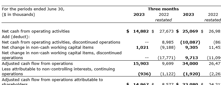 The company's management uses EBITDA, EBITDA attributable to shareholders, including the per-share amount, adjusted cash flows from operations, adjusted cash flow from operations attributable to shareholders, including the per-share amount, shareholders' equity per share and securities per share to evaluate and assess the performance of its business. These measures do not have standardized measures under international financial reporting standards and are therefore unlikely to be comparable with similar measures presented by other companies. However, management believes that most shareholders, creditors, other stakeholders and investment analysts prefer to include the use of these measures in analyzing the company's results. The company defines EBITDA as net earnings before interest, income taxes, amortization and stock-based compensation expenses, net gains or losses, and net earnings from discontinued operations. EBITDA attributable shareholders as EBITDA less the amounts attributable to non-controlling interests. The company defines adjusted cash flow from operations as net cash from operating activities, net of changes in non-cash working capital items and cash flows from discontinued operations, and adjusted cash flow from operations attributable to shareholders as adjusted cash flow from operations less the amounts attributable to non-controlling interests. A reconciliation between these measures and the most comparable IFRS measure are provided in the attached tables.
