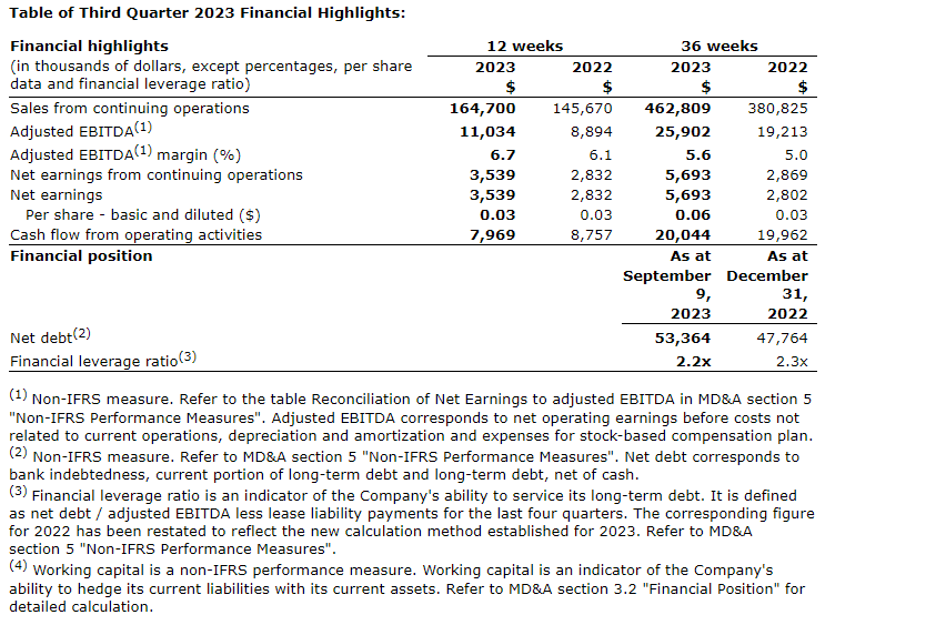 - Adjusted EBITDA (earnings before interest, taxes, depreciation and amortization) increased by 24.1 per cent to $11.0-million from $8.9-million for the corresponding period of 2022 with an adjusted EBITDA margin to 6.7 per cent of sales compared with 6.1 per cent of sales during the corresponding period of 2022.