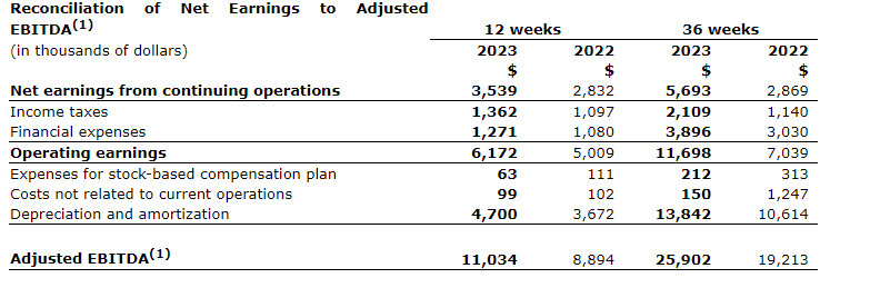 Net earnings from continuing operations and net earnings for the third quarter were $3.5-million, up from $2.8-million for the corresponding quarter of the previous year, resulting essentially from an increased adjusted EBITDA, mitigated by higher depreciation and amortization, financial and income taxes expenses.