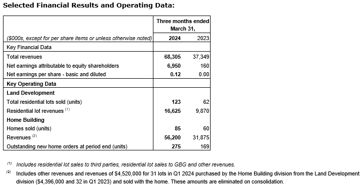 Genesis Land Development Corp. has released its financial and operating results for the three months ended March 31, 2024. Genesis Land is an integrated land developer and residential home builder with a strategy to expand its portfolio of well-located, entitled and unentitled primarily residential lands and serviced lots throughout the Calgary metropolitan area.