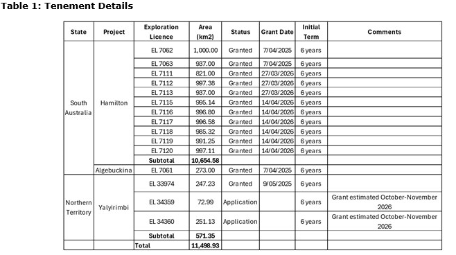 The flagship project, Hamilton basin, located in South Australia, is highly prospective for roll-front and paleo-channel type uranium. Encompassing almost the entirety of the sedimentary Mesozoic-Cenozoic basin after which the project is named, covering an area of 10,655 square kilometres of granted exploration licences (see table below), the Hamilton basin project is considered to be a large-scale, untested uranium exploration target.