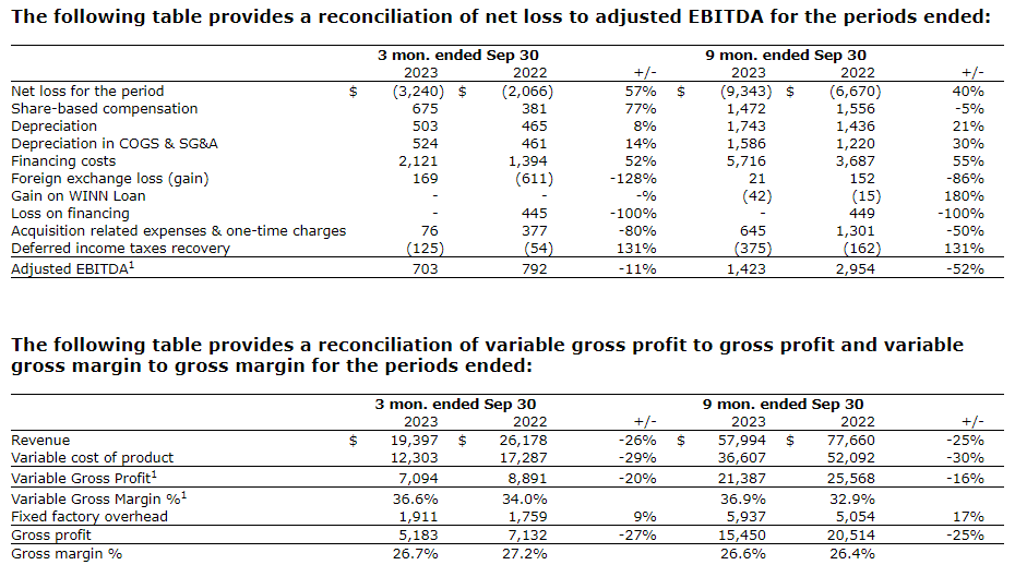 Selling, general and administrative expenses in Q3 2023 decreased by 26 per cent compared with Q3 2022. The decrease in SG&A expenses reflects the company's continuing efforts to reduce costs through headcount reductions over the past 12 months, renegotiating terms across the company's service providers and suppliers, and through process improvements designed to reduce costs and/or improve productivity. Q3 2023 SG&A excluding acquisition activity and one-time charges, declined 21 per cent on a year-over-year basis. On an annualized basis, Q3 2023 SG&A would total $13.6-million as compared with the $17.9-million in the 2022 fiscal year, representing $4.2-million in run-rate cost savings.
