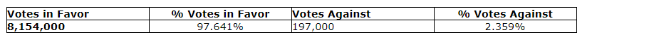 Debentureholders owning 48.41 per cent of the outstanding convertible debentures voted. The detailed results of the vote were as shown in the attached table.