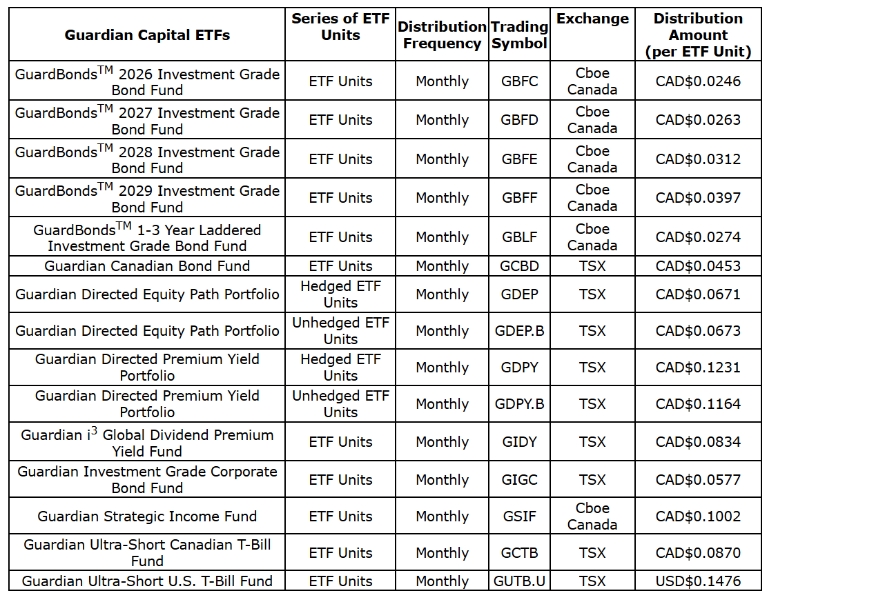 Guardian Capital LP (the manager) has declared regular cash distributions for the period ending Feb. 28, 2026, in respect of the ETF (exchange-traded fund) series of the Guardian Capital funds listed in the attached table. In each case, the distribution will be paid on Feb. 27, 2026, to unitholders of record on Feb. 23, 2026. The ex dividend date in each case is anticipated to be Feb. 23, 2026.