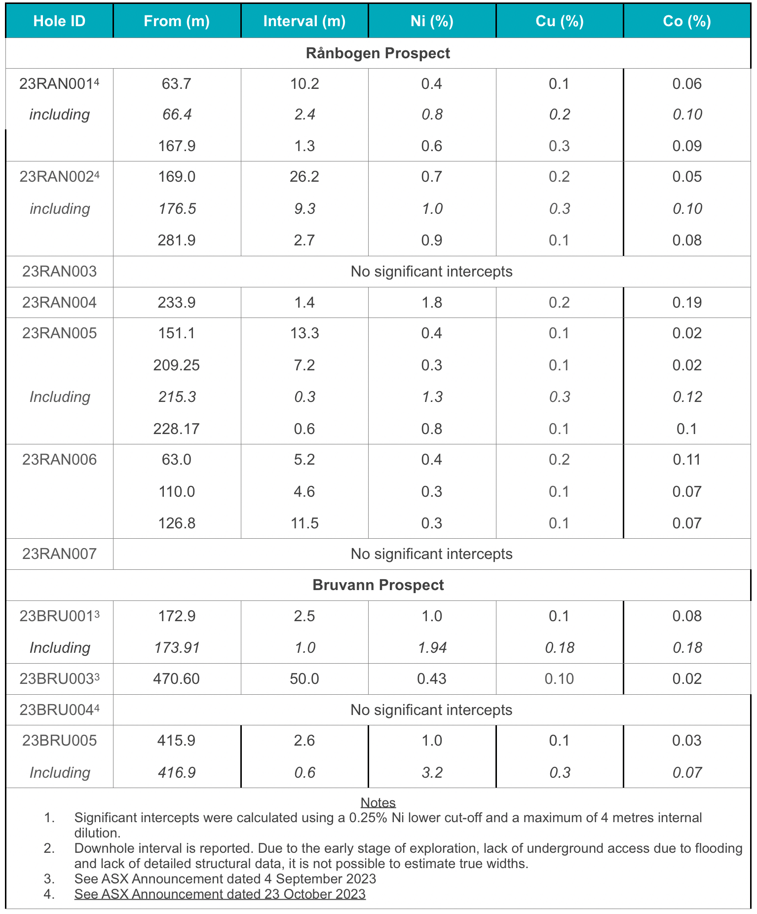 Holes 23RAN004 and 23RAN005 intercepted mineralization 60 metres up-dip and 40 metres east of the massive sulphide zone intercepted in 23RAN002 (26.2 metres at 0.7% Ni, 0.2% Cu and 0.06% Co from 169.0 metres, see ASX announcement dated 23 October 2023).