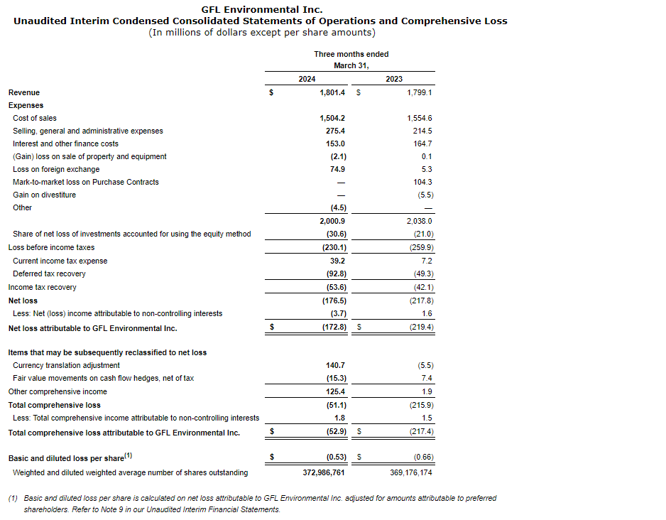 GFL Environmental Inc. today released its results for the first quarter of 2024.