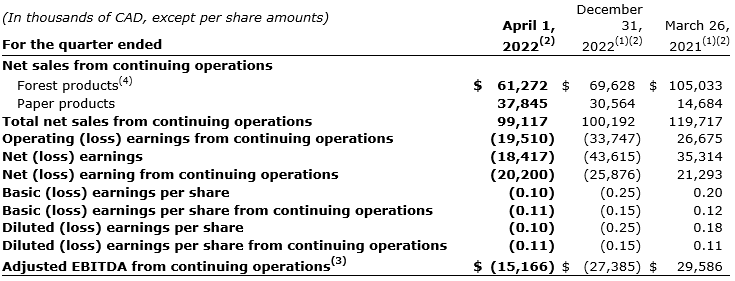 First quarter 2023 net loss from continuing operations was $20.2-million or an 11-cent loss per share (diluted), compared with net loss of $25.9-million or a 15-cent loss per share (diluted) in the fourth quarter of 2022 on the same basis; lumber prices dropped, reflecting economic headwinds and lower demand in Q1 2023, with an average selling price of $605 per thousand board feet compared with $644 per thousand board feet in Q4 2022; the Q1 2023 valuation provision for lumber and log inventory was increased to $11.9-million from $8.7-million at the end of Q4 2022;