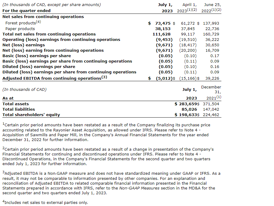 The company reported net sales for continuing operations of $111.6-million during Q2 2023, an increase of $12.5-million or 13 per cent, compared with Q1 2023. This increase was primarily driven by higher volume of lumber sold as a result of buyers building up inventory in response to uncertainties around the historic wildfires and some positive signs for United States housing starts.