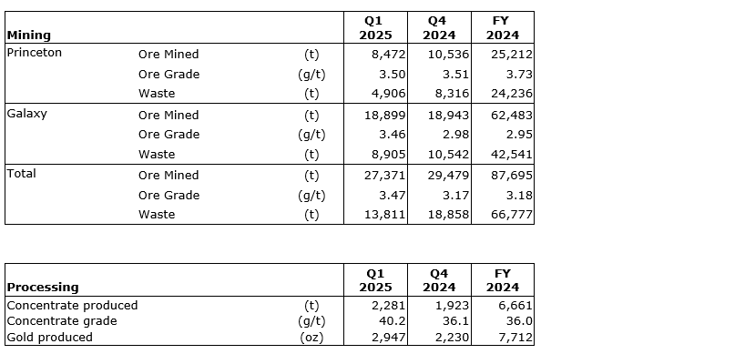 Golconda Gold Ltd. produced 2,947 ounces of gold for the first quarter of 2025 (Q1) at its Galaxy gold mine, a 32-per-cent increase in gold production compared with Q4 (fourth quarter) 2024 and a 96-per-cent increase on Q1 (first quarter) 2024.