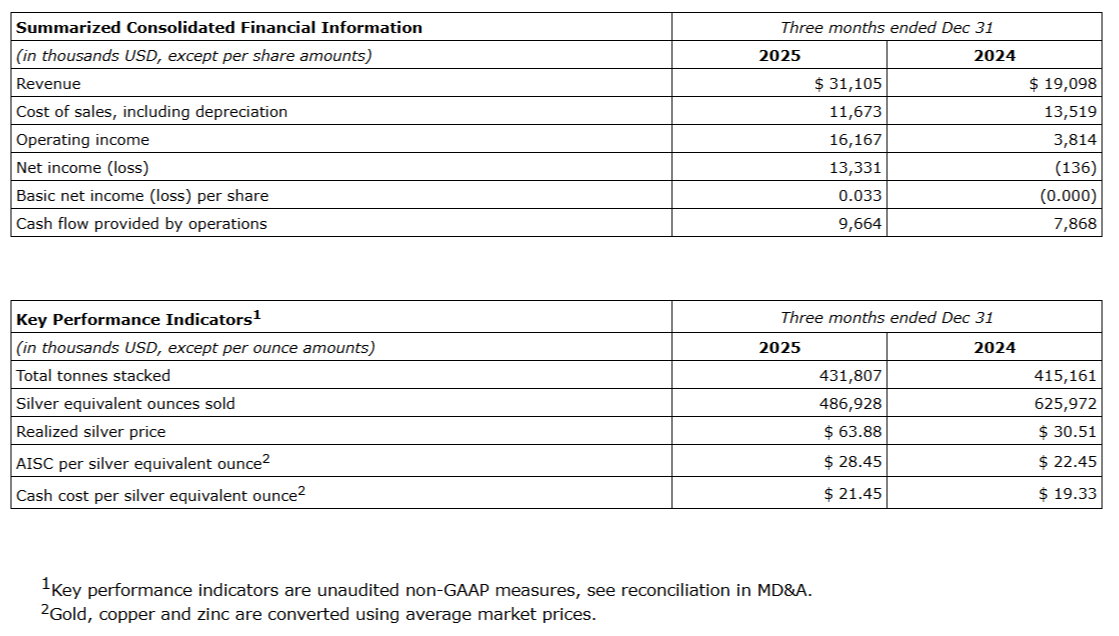 GoGold Resources Inc. has released record financial results for the quarter ending Dec. 31, 2025, with record revenue of $31.1-million (all amounts are in U.S. dollars), exceeding the previous record by 62 per cent, and record operating cash flows of $9.7-million, exceeding the previous record by 23 per cent.