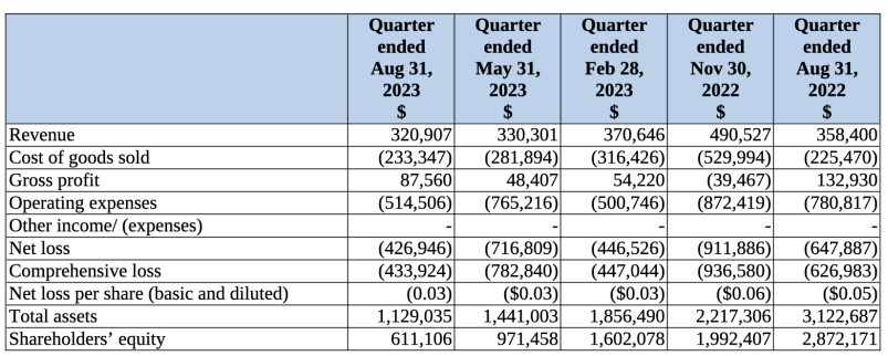 - Gross profit for the three-month period ended Aug. 31, 2023, was $87,560 or 27 per cent of revenue, a decrease from the $132,930 or 37 per cent of revenue reported for the same three-month period last year, due to the aforementioned change in product sales mix as a result of seasonal variations.