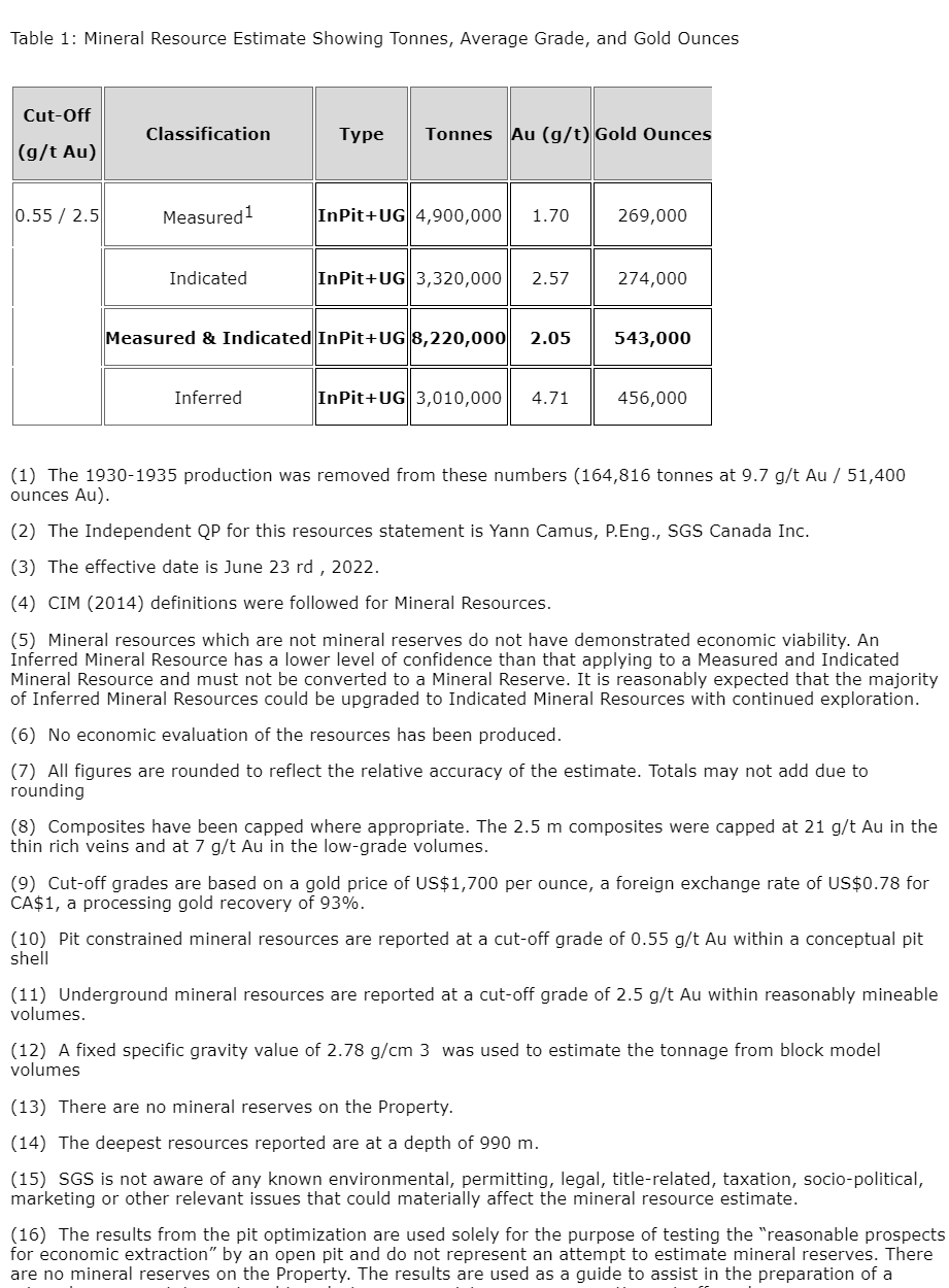 On Aug. 20, 2022, the company released an updated National Instrument 43-101 technical report supporting the resource estimate update for the Granada gold project (please see July 6, 2022, news release) reporting that the Granada deposit contains an updated mineral resource, at a base case cut-off grade of 0.55 g/t gold for pit-constrained mineral resources within a conceptual pit shell and at a base case cut-off grade of 2.5 g/t for underground mineral resources within reasonably minable volumes, of 543,000 ounces of gold (8.22 million tonnes at an average grade of 2.05 g/t Au) in the measured and indicated category, and 456,000 ounces of gold (3.01 million tonnes at an average grade of 4.71 g/t Au) in the inferred category. Please see the table entitled "Mineral resource estimate showing tonnes, average grade and gold ounces" for full details. Report reference: Granada gold project mineral resource estimate update, Rouyn-Noranda, Que., Canada, authored by Yann Camus, PEng, and Maxime Dupere, BSc, PGeo, SGS Canada, dated Aug. 20, 2022, and with an effective date of June 23, 2022.