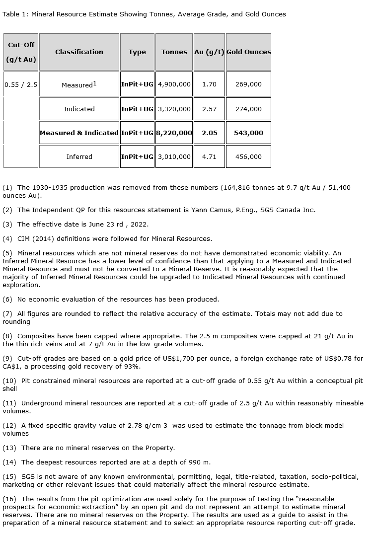 On Aug. 20, 2022, the company released an updated National Instrument 43-101 technical report supporting the resource estimate update for the Granada gold project (please see July 6, 2022, news release) reporting that the Granada deposit contains an updated mineral resource, at a base case cut-off grade of 0.55 g/t gold for pit-constrained mineral resources within a conceptual pit shell and at a base case cut-off grade of 2.5 g/t for underground mineral resources within reasonably minable volumes, of 543,000 ounces of gold (8.22 million tonnes at an average grade of 2.05 g/t Au) in the measured and indicated category, and 456,000 ounces of gold (3.01 million tonnes at an average grade of 4.71 g/t Au) in the inferred category. Please see the attached table for full details (report reference: Granada gold project mineral resource estimate update, Rouyn-Noranda, Que., Canada, authored by Yann Camus, PEng, and Maxime Dupere, BSc, PGeo, SGS Canada, dated Aug. 20, 2022, and with an effective date of June 23, 2022).