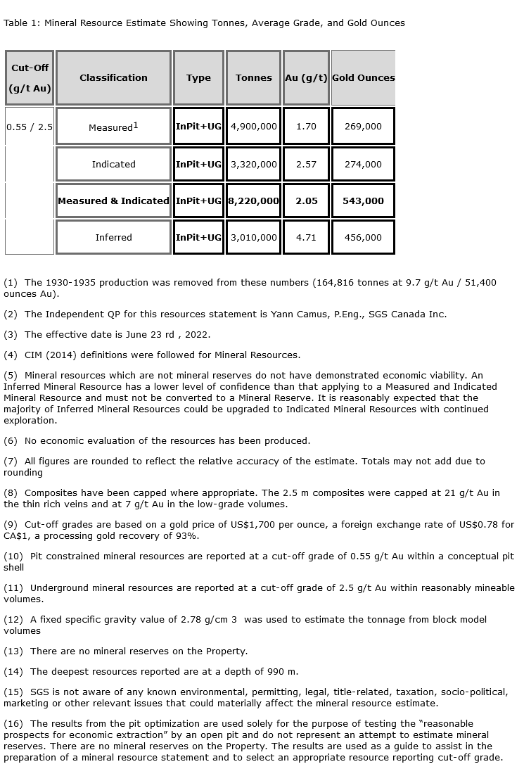 On August 20, 2022 the Company released an updated NI 43-101 technical report supporting the resource estimate update for the Granada Gold project (Please see July 6, 2022 news release) reporting that the Granada deposit contains an updated mineral resource, at a base case cut-off grade of 0.55 g/t Au for pit constrained mineral resources within a conceptual pit shell and at a base case cut-off grade of 2.5 g/t for underground mineral resources within reasonably mineable volumes, of 543,000 ounces of gold (8,220,000 tonnes at an average grade of 2.05 g/t Au) in the Measured and Indicated category, and 456,000 ounces of gold (3,010,000 tonnes at an average grade of 4.71 g/t Au) in the Inferred category. Please see Table 1 below for full details. Report reference: Granada Gold Project Mineral Resource Estimate Update, Rouyn-Noranda, Quebec, Canada authored by Yann Camus, P.Eng. and Maxime Dupere, B.Sc, P.Geo., SGS Canada Inc. dated August 20th, 2022 and with an effective date of June 23rd, 2022.