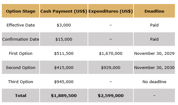 Golden Goose retains full flexibility to accelerate option payments or exploration expenditures at its discretion, allowing the company to advance the project on an accelerated timeline if warranted by results. Exploration expenditures may be substituted, in whole or in part, with cash payments to Valcheta.