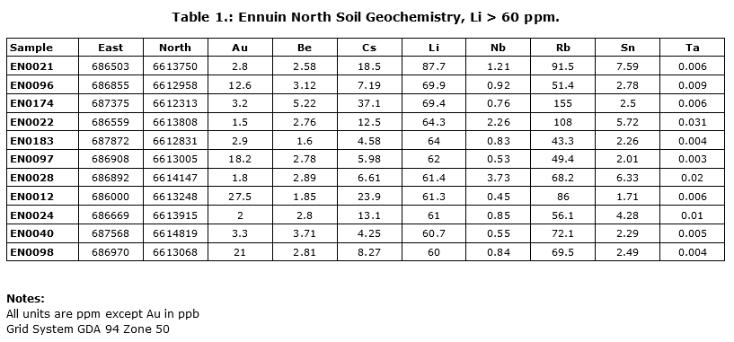 The soil samples were delivered to Labwest Minerals Analysis Pty Ltd (Labwest) in Malaga WA for sample preparation and chemical analysis using the Ultrafine(TM) assay technique developed by the CSIRO to better detect subtle anomalies under transported cover. Samples were assayed using an ICPMS finish for 53 elements including lithium and associated elements. The results for lithium and other key elements for all the 240 soil samples are presented in Appendix 1, and the +60ppm Li results and associated elements are presented in Table 1.